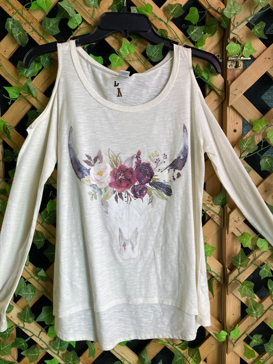 Dare Me Wear Floral Long Horn Crown Cold Shoulder Top