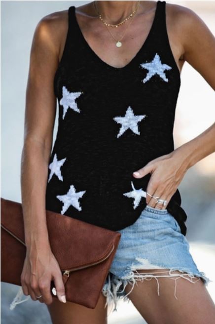 Black Rhinestone American Flag Printed O-Neck Graphic Tank Top