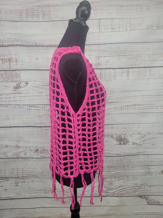 Adora Hot Pink Fishnet Crochet Tank Top With Fringe Hem